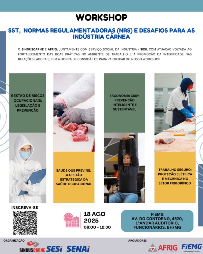 O Sindicato Intermunicipal das Indústrias da Carne e Derivados e do Frio de Minas Gerais – SINDUSCARNE, a Associação de Frigoríficos de Minas Gerais, Espírito Santo e Distrito Federal – AFRIG, juntamente com Serviço Social da Indústria – SESI , com atuação voltada ao fortalecimento das boas práticas no ambiente de trabalho e à promoção da integridade nas relações laborais, tem a honra de convidá-lo para participar do Workshop SST, Normas Regulamentadoras (NRs) e desafios para as indústria cárnea, que será realizado no dia 18 de agosto de 2025 (segunda-feira), às 08h00, em FIEMG Edifício Albano Franco, à AV. do Contorno, 4.520, 1° andar, auditório, Bairro Funcionários, Belo Horizonte-MG.